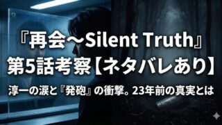 ドラマ『再会~Silent Truth』第5話の衝撃ラストを徹底考察!主人公・飛奈淳一(竹内涼真)が見せた涙の理由と、親友・直人の「淳一が撃った」という衝撃の告白の真意に迫ります。23年前に埋めた拳銃が現代の殺人事件で使われた謎や、第1話からの手洗いの伏線など、ネタバレありで深掘り解説。